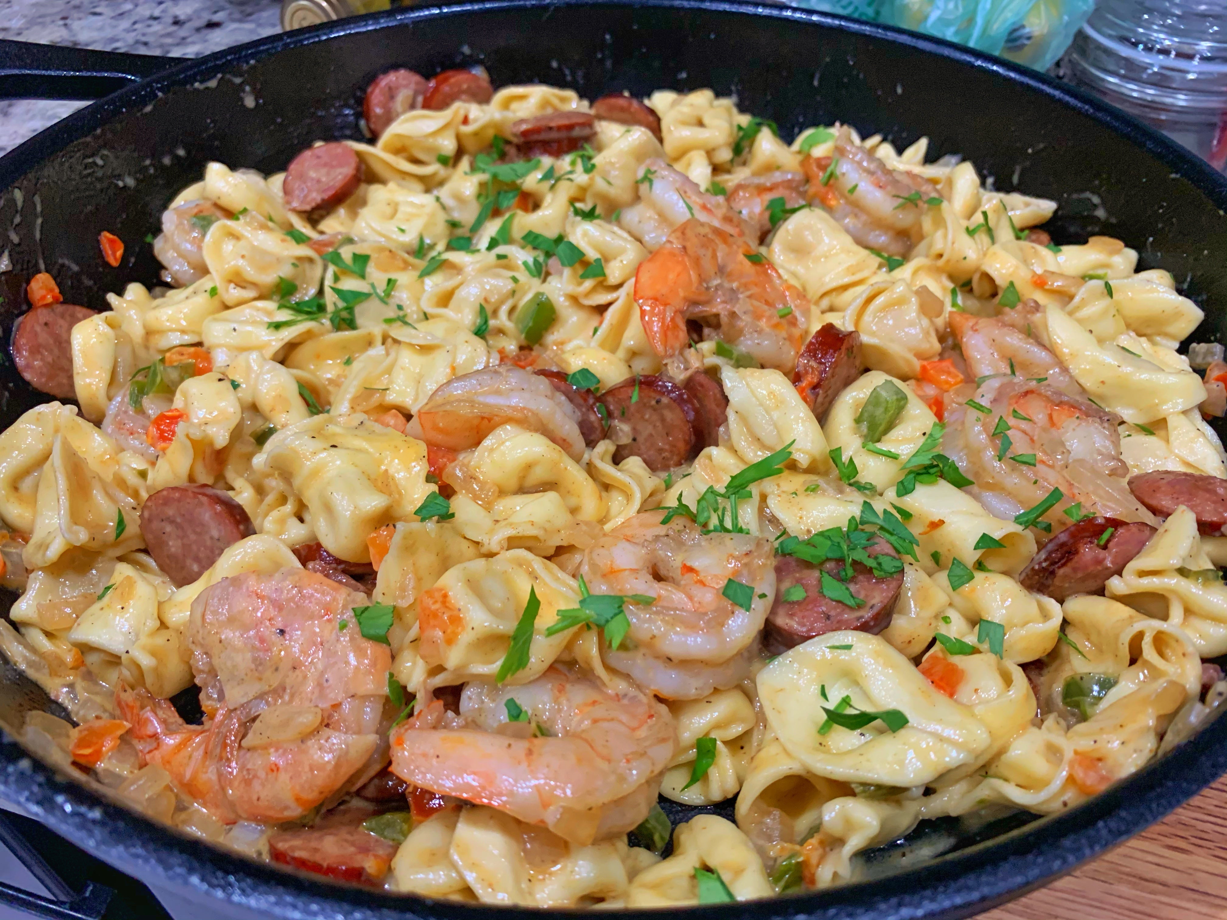 This recipe came about as a result of canvasing my pantry and fridge for dinner possibilities. I just so happened to have some jumbo shrimp and andouille sausage. The decision was then to decided whether to serve it over rice or pasta. Fresh three cheese tortellini was a different spin I decided to use. This recipe will also be excellent using a creamy base similar to our Shrimp and Grits recipe.